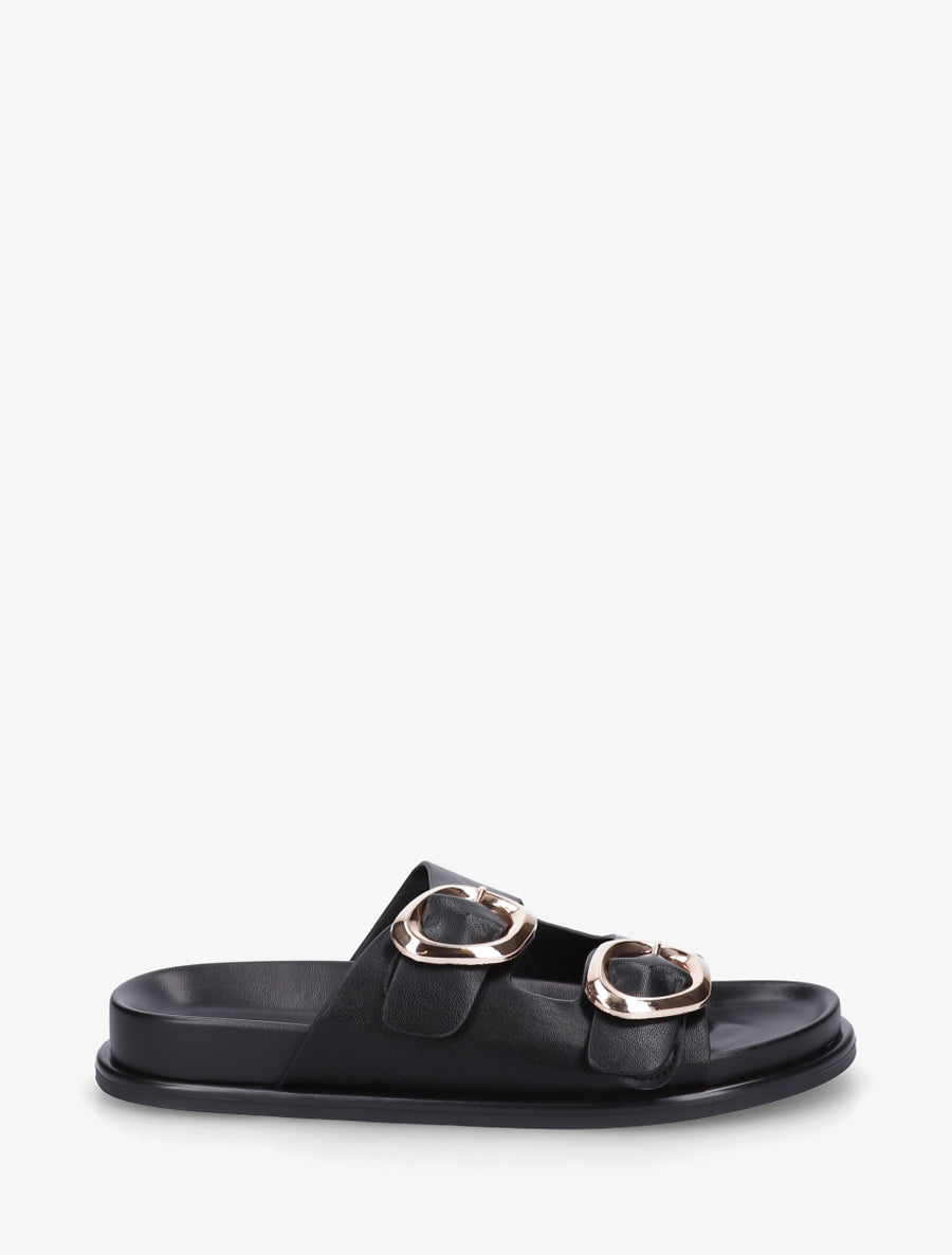 Sandalias planos de imitación de piel con doble hebilla - Negro