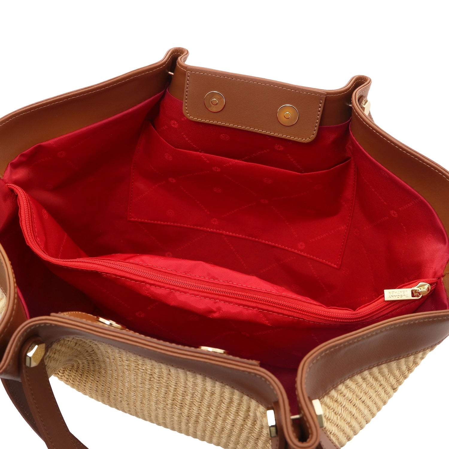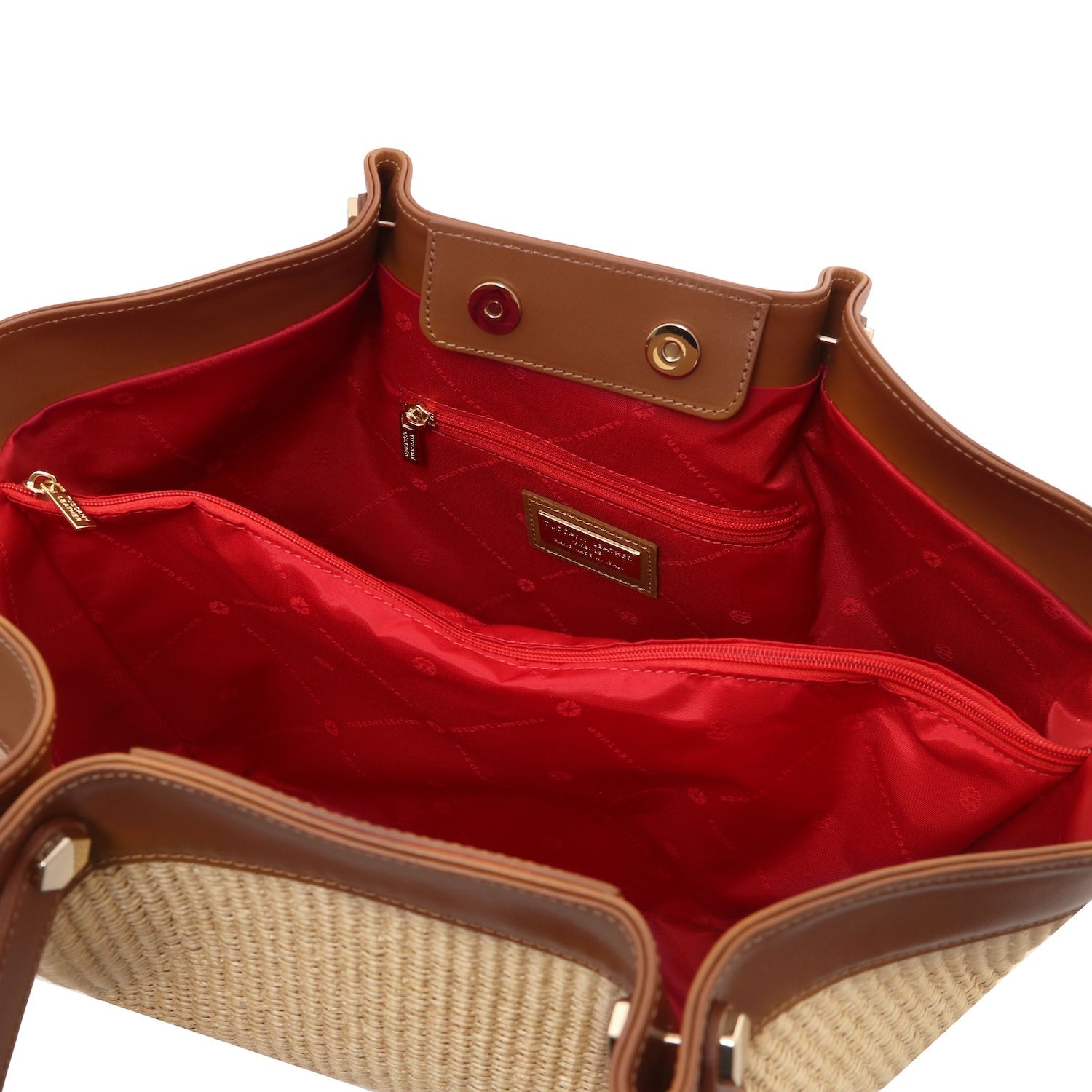 Acabado: Herrajes en tono dorado, logotipo estampado en caliente en color dorado y patas protectoras de metal.Soleil es tu bolso de verano de edición limitada: ligero, espacioso y perfecto para los días soleados. La rafia tejida le aporta una textura veraniega, mientras que la piel lisa le da un toque elegante. Desde mañanas de mercado hasta tardes de aperitivo, es el bolso que convierte cualquier look en una escapada.